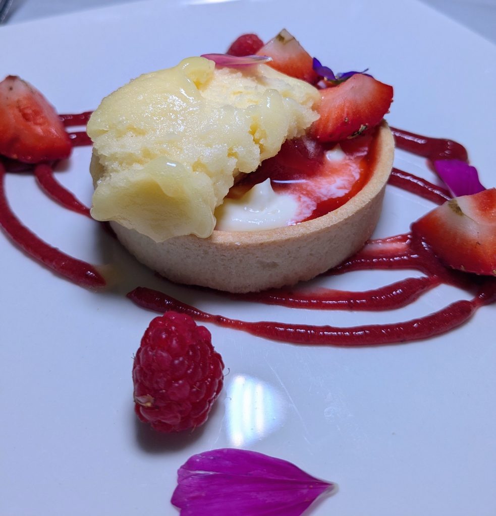 My choice of Courgette & Spinach Custard Tart (mint, radish, broad beans and parmesan) was a deliciously light and tasty appetiser ahead of the hearty Lamb Rump (boulangère, broccoli, baba ganoush, lamb oats, jus) and palate-cleansing Clotted Peach Melba (with almond sable biscuit, peach bavarois and raspberry ripple ice cream.) Particularly enjoyed the crunchy texture of this dish – and hubby and son savoured their Iced Chocolate Parfait (with griottine cherries and pistachio ganache) and Clotted Cream Panna Cotta (with macerated strawberries, sable biscuit and strawberry sorbet.)